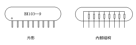 图中BX表示产品型号,10表示有效数字,3表示有效数字后边加“0”的个数,103即10000Ω(10K)。半字线“--”后面的9表示此电阻有9个引脚,其中的一个引脚是公共引脚,一般都在两边,用色点标志。