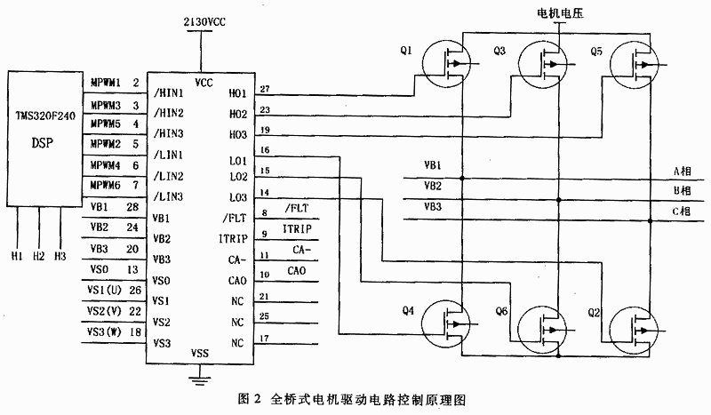 IR2130芯片可同时控制六个大功率管的导通和关断顺序,通过输出HO1,2,3分别控制三相全桥驱动电路的上半桥Q1、Q3、Q5的导通关断,而IR2130的输出LO1,2,3分别控制三相全桥驱动电路的下半桥Q4、Q6、Q2的导通关断,从而达到控制电机转速和正反转的目的。